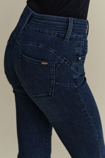 Cleverly designed jeans with hidden support providing extra waist smoothing. With a curved gap free waistband to support and slim and a high rise waist for a flattering fit. Featuring ecomade fibres, recycled zip tape and recycled thread.