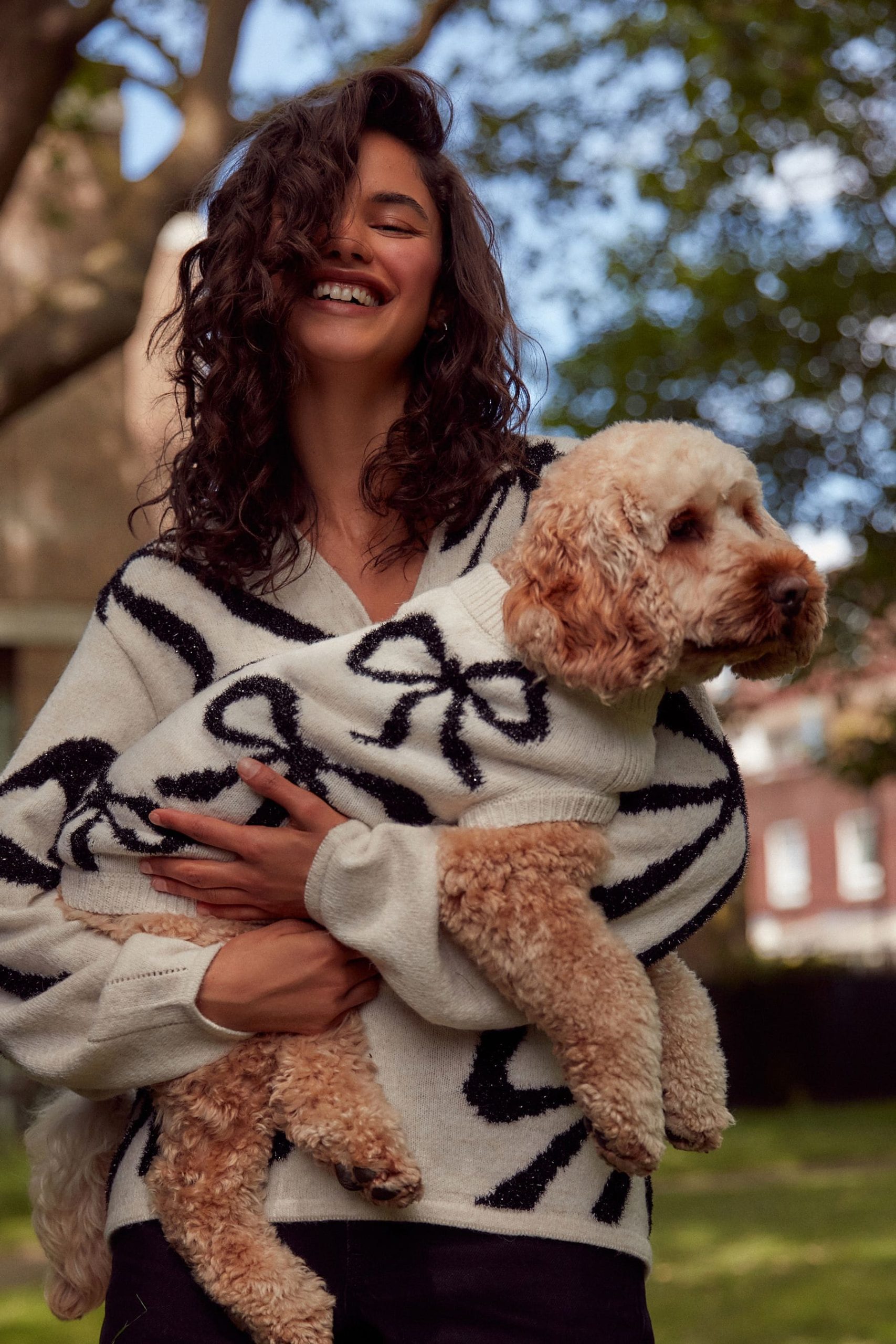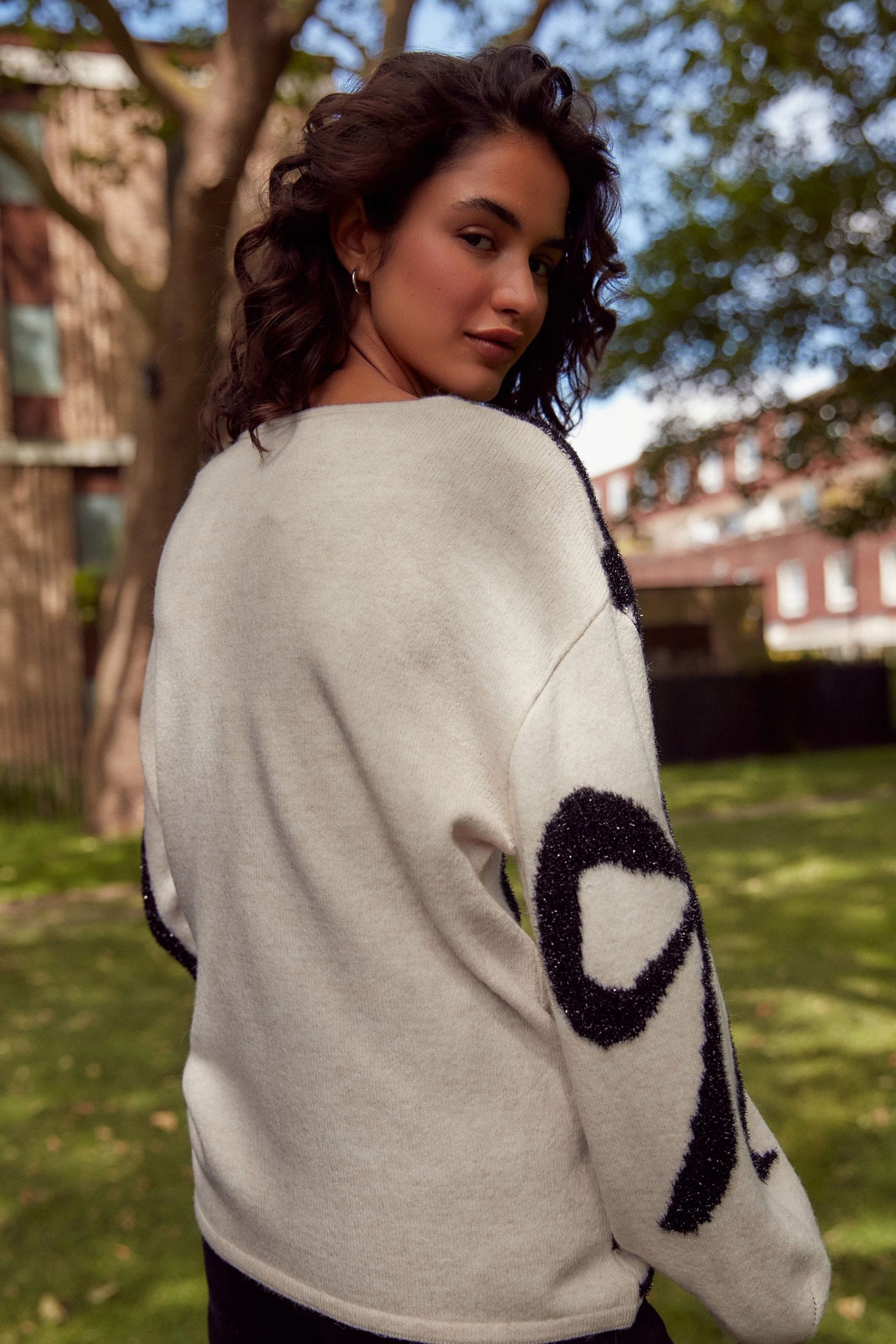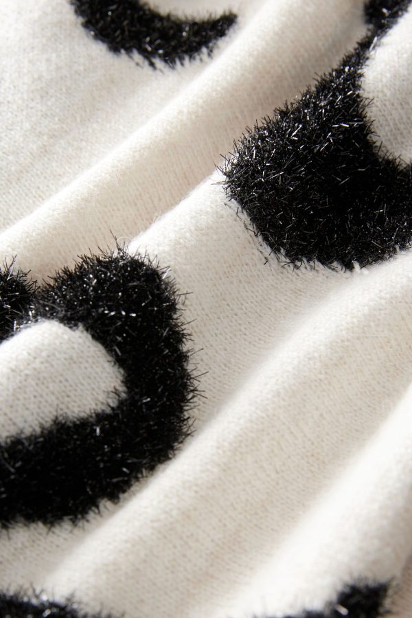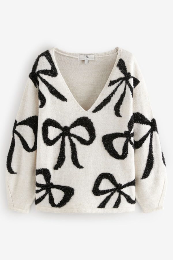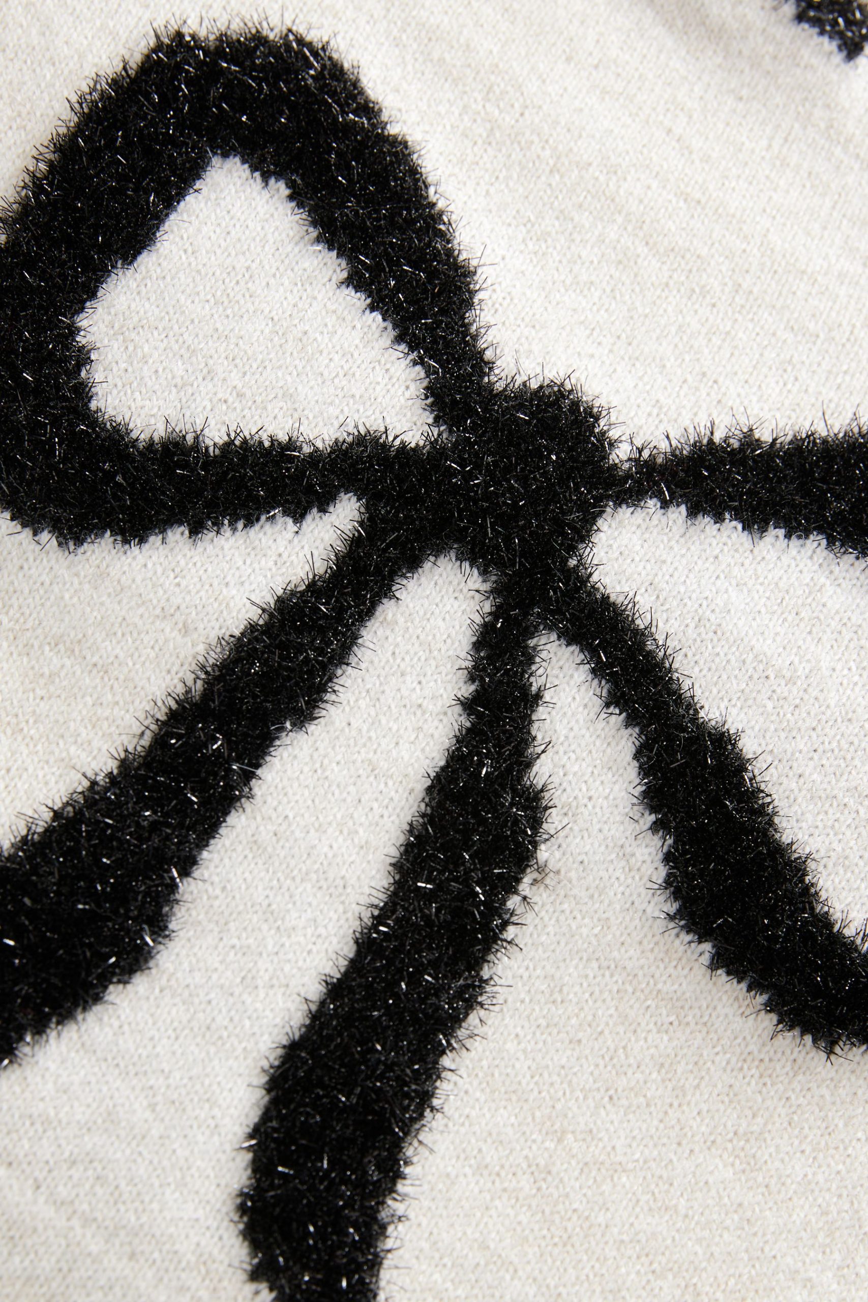 With a unique look for the festive season, this wool-blend jumper in white and black tinsel bow has a short sleeve design with a crewneck collar, finished in a selection of different Christmas designs