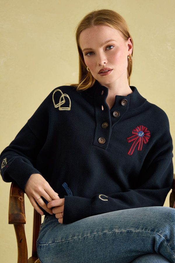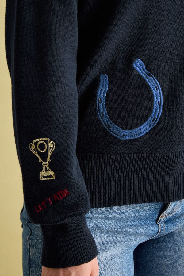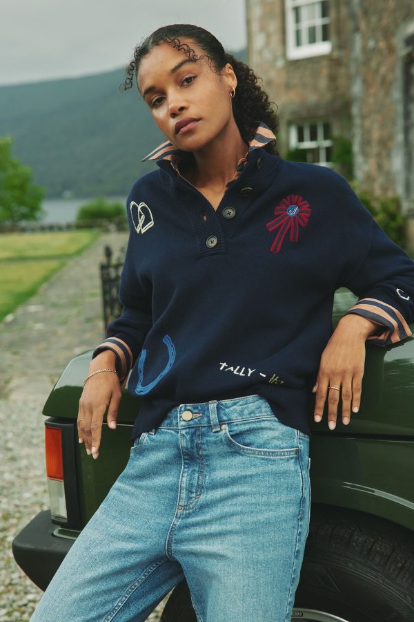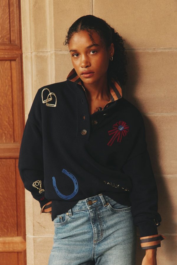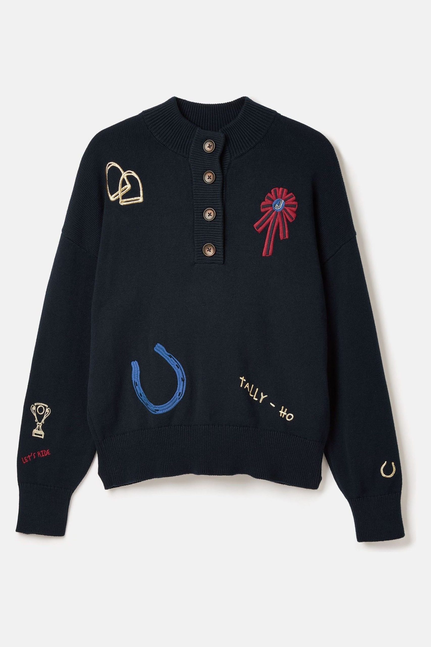 Take the new season by the reins and be playful with your style with the Buckley Jumper. The perfect blend of country and cool it features a mix of equestrian intarsia artwork and quality embroidered details to create a memorable piece that will certainly raise a few smiles. From a horseshoe and winning rosette to slogans and a surprise on the back, great attention to detail has been paid. The jumper itself is crafted from 100% cotton so you can trust it will be an enduring part of your wardrobe and has a quarter button placket which allows for versatile styling. Dropped shoulders adds a laid-back feel and it??s finished with ribbed hem, neck and cuffs. Simply style with jeans and trainers – and let the jumper do the talking! 100% cotton. Quarter button placket. Dropped shoulders. Ribbed neck, hem and cuffs. Equestrian embroideries and intarsia to the front and back